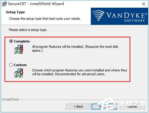 4、在此界面用户需要选择安装类型,包括“Complete(完整版)”和“Custom(自定义)”,一般用户选择“Complete”即可,然后点击下方的“Next”。如果需要重新设置则点击“Back”;