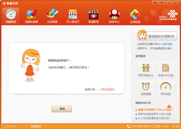 1.提速体验:面向北京联通后付费ADSL用户,提供每月72小时提速体验服务。最高可提速至20M。