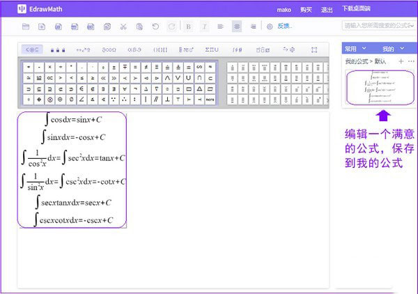 当大家编辑完成一个自己满意的数学公式后,可以在线保存到我的公式,方便下次使用。即使更换电脑,只要登录账号,也可以应用这些已收藏的公式。