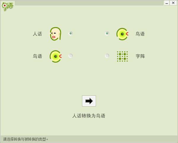 鸟语2003有3种转换功能:1.人话转为鸟语。2.鸟语转为人话。3.人话转为字阵。
