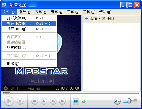 2、点击“菜单”→“打开 DVD(D)”,将光驱中的DVD文件加入播放列表中,且立即开始播放DVD。(关于播放控制)