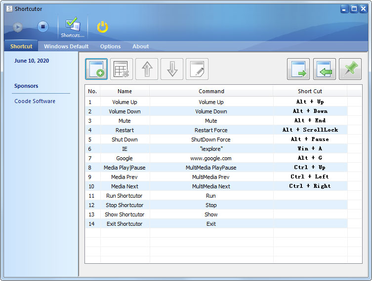 shortcutor是免费好用的快捷键管理工具。可以方便的添加和管理常用程序的快捷键,实现快速启动所需的程序。另外,它还支持快捷键调节音量、用普通或强制方式重启或关机等。