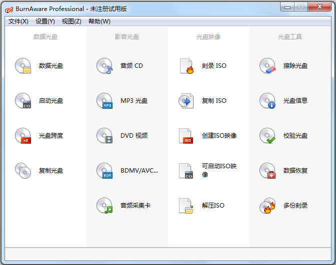 BurnAware Professional是一款强力的刻录工具,它支持CD,DVD,蓝光光盘和HD-DVD的媒体,支持所有标准的光存储介质包括CD-R/RW,DVD-R/RW,DVD+R/RW,BD-R/RE,HD-DVD-R/RW和DVD-RAM等,也支持相当多的刻录设备。