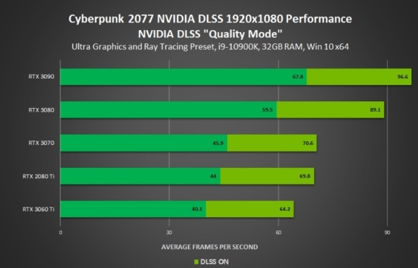 英伟达表示游戏同时打开光追和DLSS后,游戏帧率可提升最少40%,最多可达惊人的2.3倍,尤其是4K分辨率下最明显,RTX 3090、RTX 3080可以从严重卡顿的22FPS、15.5FSP直达非常流畅的57.8FPS、51.8FPS。